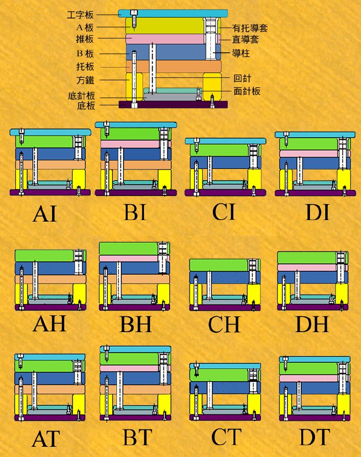 大水口模架 (又稱單分型面模架), 標準長闊尺寸由 150mm x 150mm (簡稱1515系列) 至 600mm x 800mm (簡稱6080系列); 因不同之A板, B 板, 推板及托板組合, 共分 A, B, C, D 四個型號。 而模架因碼模結構不同, 而有工字模 (I型), 直身模 (H型)及直身模加面板 (T型) 三類, 結合 A,B,C,D 四個型號, 標準大水口模架共有 12 種不同型號規格, 模具制作者可因應產品要求而配置不同之板厚組合。